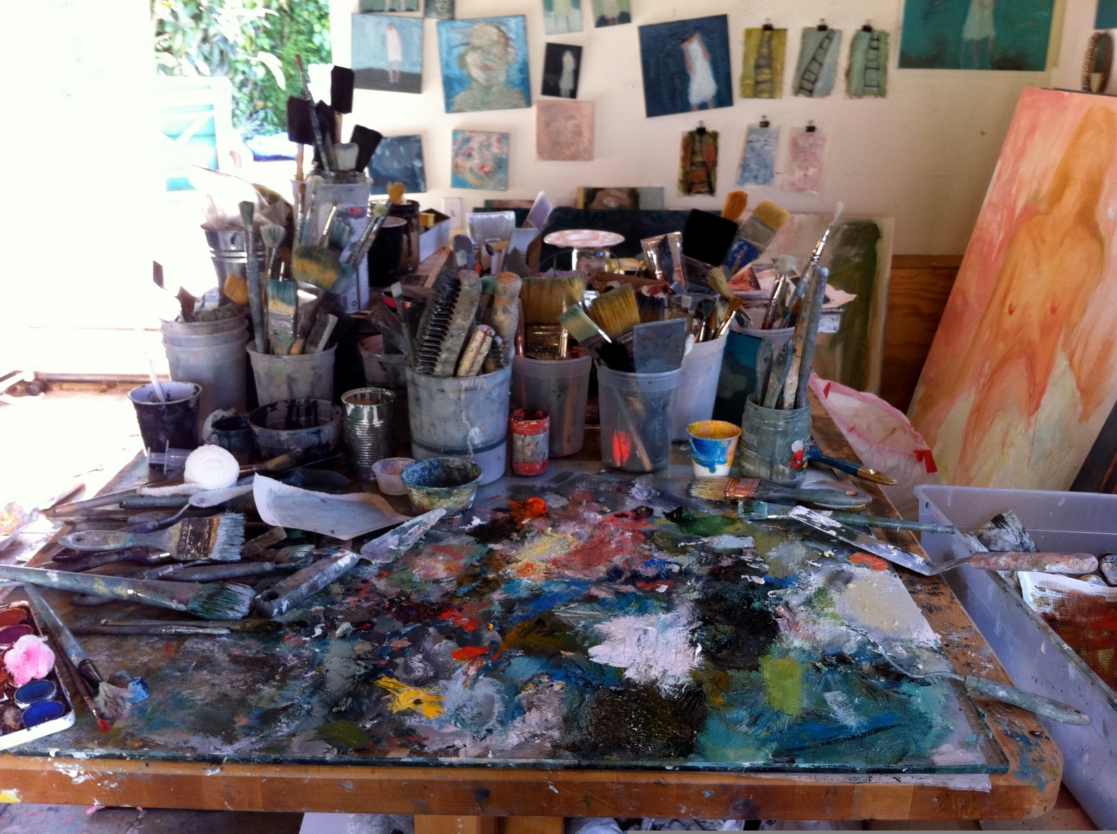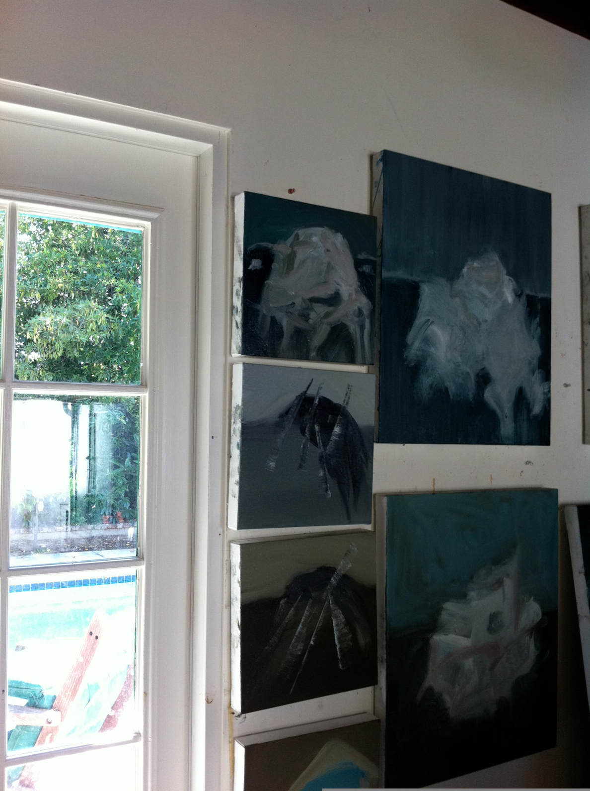 One of the difficulties I am facing is crowding in the studio. Although I don't paint every day, I work pretty fast when I do paint, and I have had to rent a storage unit because I have run out of room. Also, although having a home studio is really convenient, I am looking forward to a time when I can work in a studio that allows me to paint really large- right now, the biggest canvas I can work on comfortably is maybe 6 feet! Mostly, I work on canvas on various sizes and will trade out the one on the easel (I'm not able to work directly on the wall) but I also work sitting or kneeling on the ground; I like to hold small works on my lap and even walk around the studio and the garden a bit while painting. It's a different experience to paint while walking.