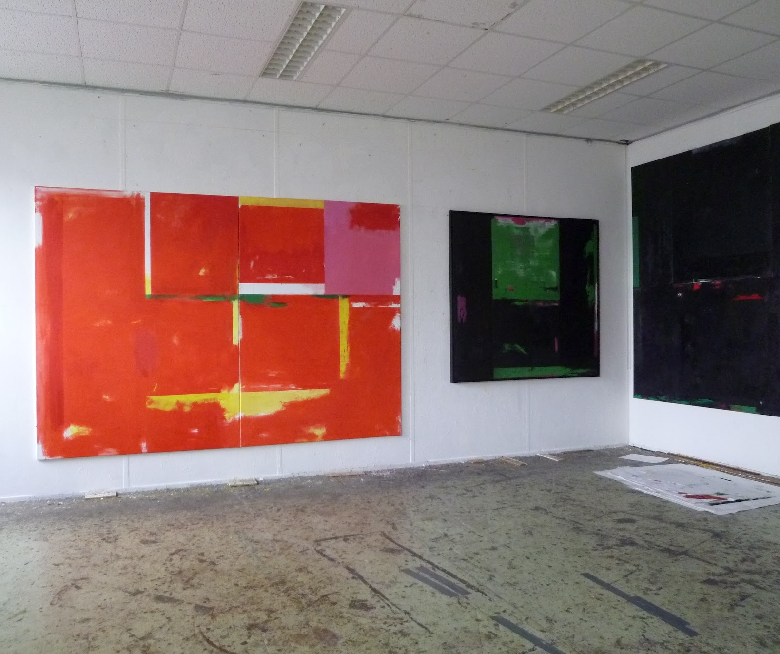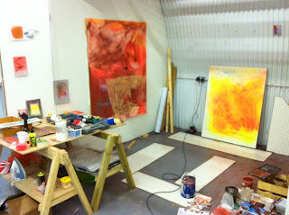 At the moment, I work in a corner of my flat by a north facing window, with a view onto my patio area. I don't get distracted easily, and the strange thing is that the view out of the window doesn't influence my work. I tend to be quite focused on the questions and dilemmas brought up by my sketches and notes, and inner images. I also like to work with my painting on the floor, and walk around it, especially when working on large canvases.