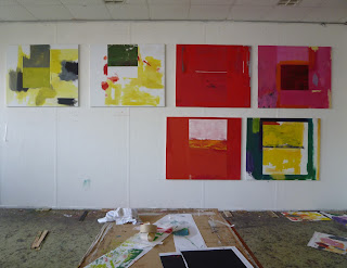 I like to start as early in the morning as possible, to have at least 4 to 5 hours to paint without the distractions that usually come later in the day! I work in series as I like to allow ideas to bounce off one another, from canvas to canvas. This way I don't get blocked by any particular canvas, and also elements from one may suggest ways to resolve another painting. When I am working, I have about 5 or 6 canvases around me, and various notes and sources of reference scattered across the floor. There's a lot of coffee drinking going on. As I paint, one or two canvases pull me in and I will work intensively on these. They possess me, even when I'm away from the easel.